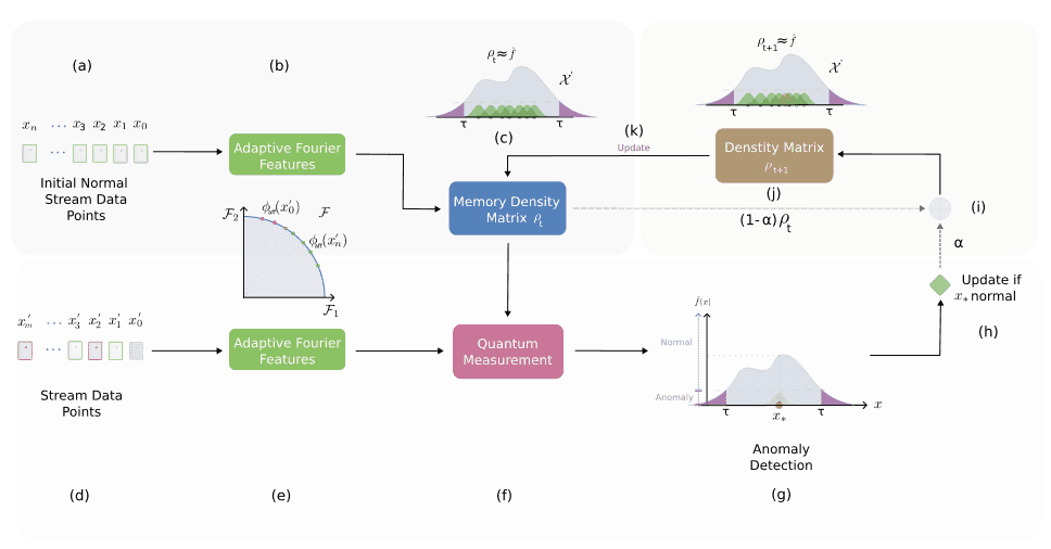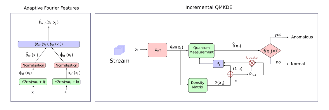 INQMAD, a novel method for streaming anomaly detection that uses incremental density estimation with random Fourier features, quantum measurement principles, and density matrices to address these challenges.
