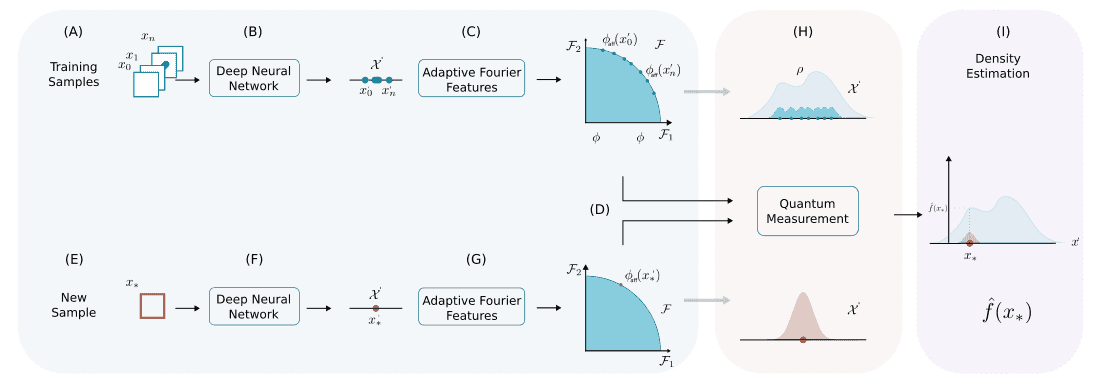 Density estimation is a fundamental task in statistics and machine learning that aims to estimate, from a set of samples, the probability density function of the distribution that generated them. There are different methods for addressing this problem but recently deep-neural density estimation methods have emerged as a powerful alternative. This paper presents a novel method for neural density estimation based on density matrices and adaptive Fourier features. Density matrices are commonly used in quantum mechanics to represent the quantum state of a physical system. In this work, they are used to estimate probability densities using an operation called quantum measurement. The proposed method can be trained without optimization using an averaging operation over the samples of the training dataset. It can also be integrated with deep learning architectures and trained using gradient descent. The performance of the proposed method was evaluated on a range of synthetic and real datasets and compared with fast kernel density estimation and state-of-the-art neural density estimation methods. The results demonstrate that the proposed method achieves competitive performance while being faster and more efficient than existing methods.